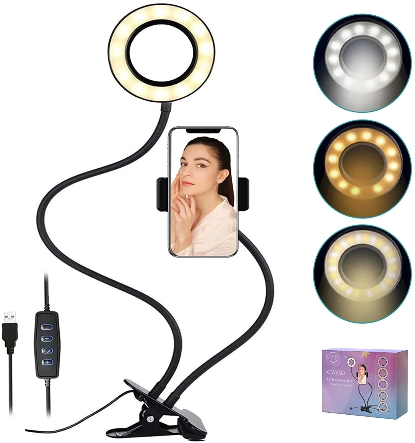 KEAYEO 3.5" Selfie Ring Light with Clamp and Phone Holder for LiveStream/Makeup Video Photography, Reading Light with Clip, 3 Light Modes 39 Brightness. You will need to buy 2 for maximum light coverage from both sides. You need to clamp this to a sturdy desk edge that is not easily dented or scratched.